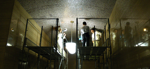 | ● 株式会社竹中工務店によりローリングタワー2機設置 ● 金属専用工具にて触診及び目視 ● 状況に応じ金属専用工具及びハンマーにてピースを外す ● 状況に応じ写真撮影 |